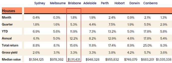 Against the other capitals, Brisbane remains one of the frontrunners.  Perth is still the standout, with values up 2.4% over the month and 7.4% over the quarter, while Adelaide matched Brisbane’s 1.9% monthly result but posted slightly softer quarterly gains. Sydney and Melbourne, by comparison, delivered more modest monthly rises of 0.5% and 0.3% and quarterly growth around 1.6 – 1.8%, highlighting that price growth remains skewed towards the mid-sized capitals where listings are tighter.