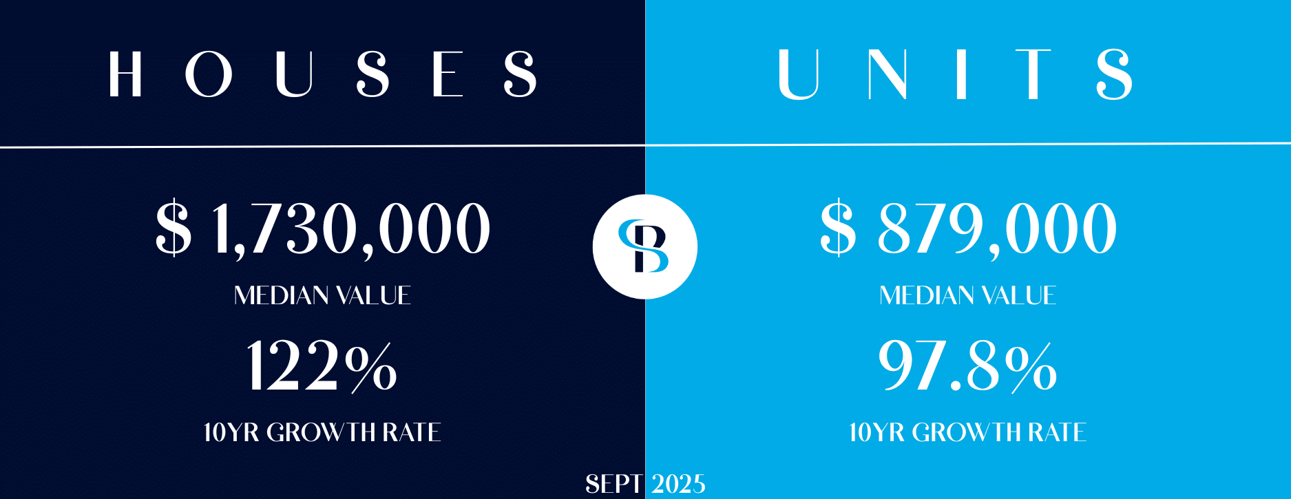 - Property Market: Median house price $1.73M; units $879K (Sep 2025). Strong 10-year growth of 122% (houses) and 97.8% (units); low vacancy rate 0.9%.