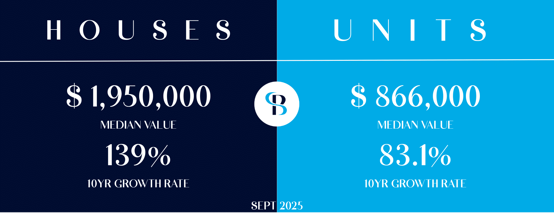 - Property Market: Median house price $1.95M (Sep 2025) with 10-year growth of 139%; units median $866K with 83.1% growth.